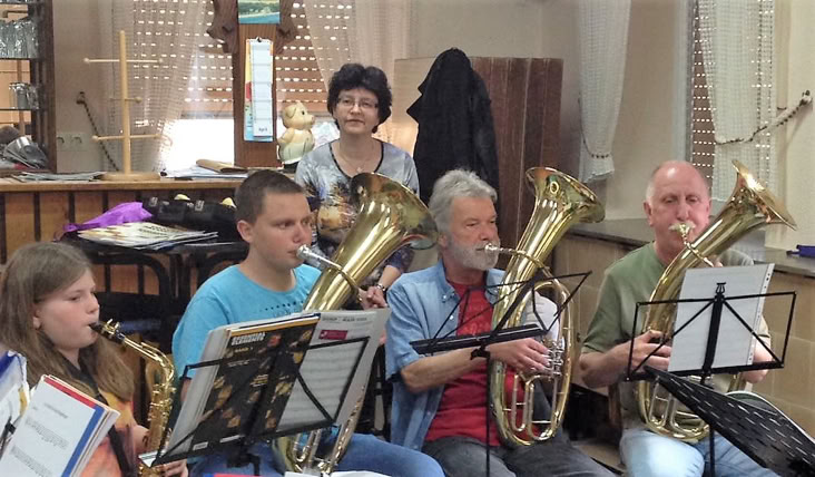 Vier gestandene Musiker an den Tenorhörnern (Thomas Trendl, Claus Bopp, Lothar Sieger und Nicolai Sieger) hatten sich danach die Originalkomposition böhmischer Blasmusik vorgenommen. Sie intonierten die Polka: „Goldene Tenorhörner“ . Man konnte jedem Solisten die Spielfreude an den Gesichtern ablesen. Blasmusik von Herz zu Herz.