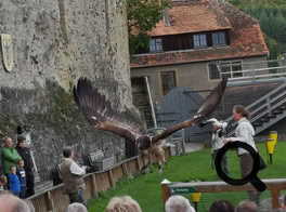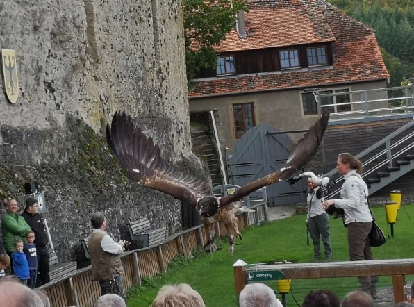 Als alle gestärkt waren, ging die Busfahrt weiter nach Haßmersheim zur Burg Guttenberg. Dort wurden wir schon erwartet, um an der beeindruckenden Vorführung der großen Vögel teilzunehmen. Wir erlebten eine spektakuläre Flugshow der riesigen Greifvögel und Eulen und bestaunten diese später in ihren Volieren. Eine Vitrinen-Ausstellung in der Zwingeranlage zeigte auch die typischen Lebensräume dieser schönen Tiere.