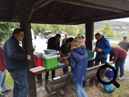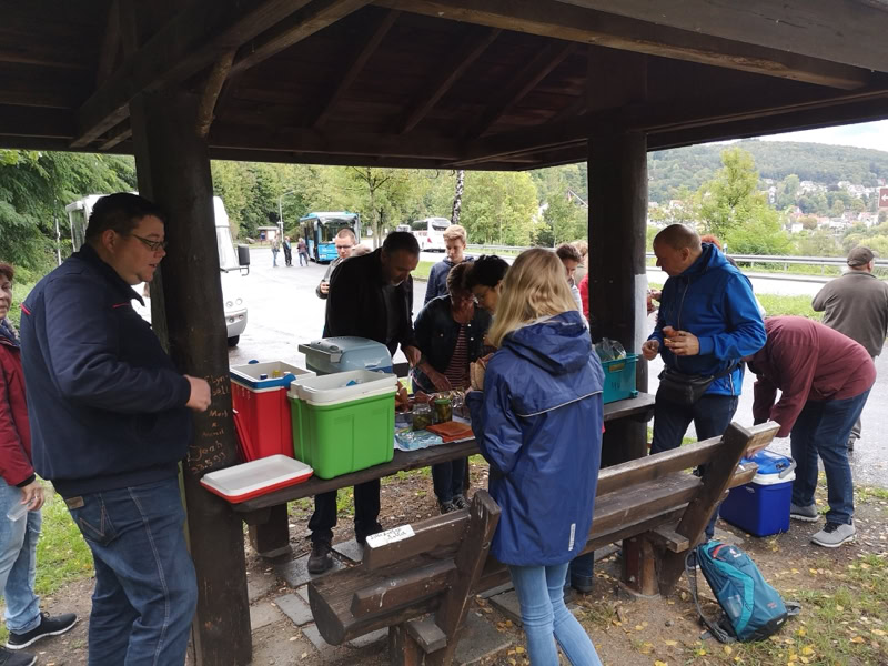 In Neckarsteinach hieß es dann auch Endstation für uns, denn unser Busfahrer wartete bereits an derAnlegestelle. Mittlerweile hatten wir alle einen Riesenhunger und so stärkten uns auf einem Parkplatz mit Weck, Worscht und Woi. Herrlich! Genau das Richtige nach so einer schönen Schiffsfahrt.