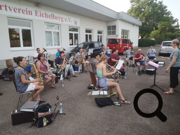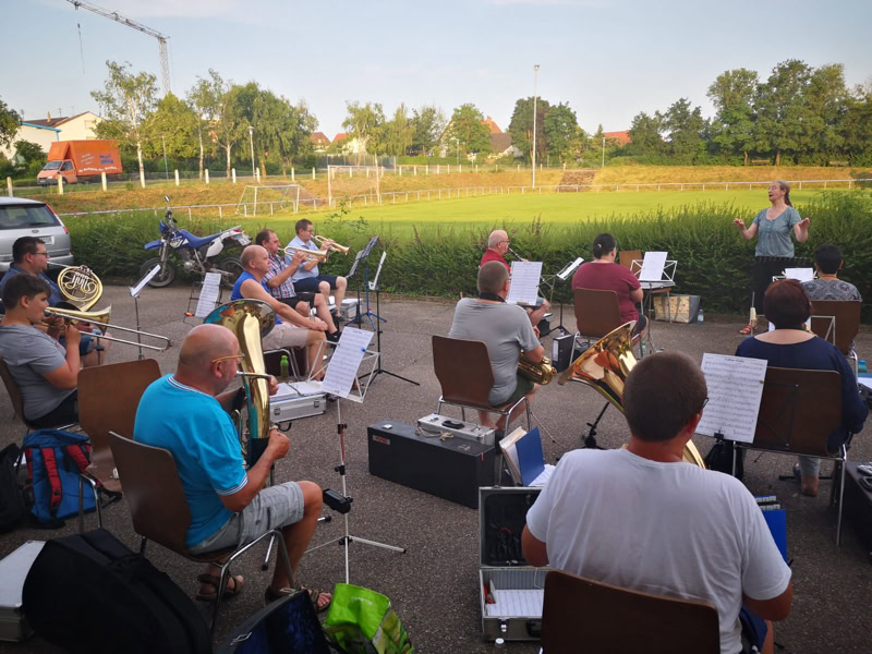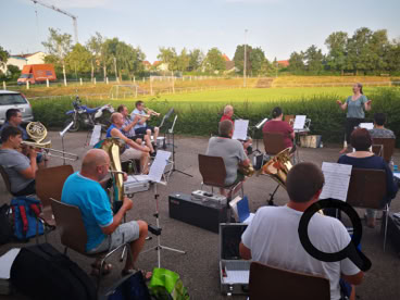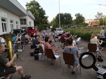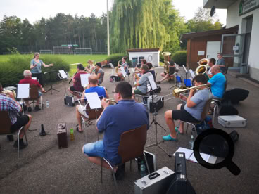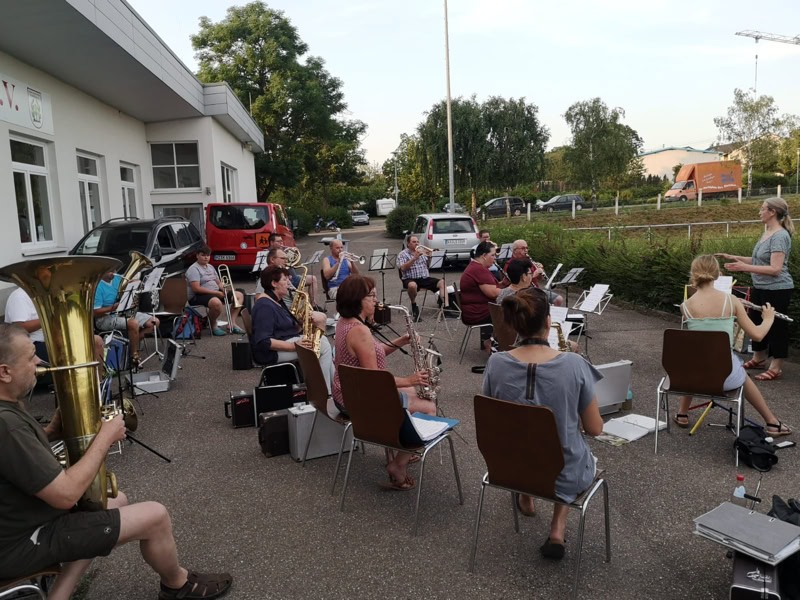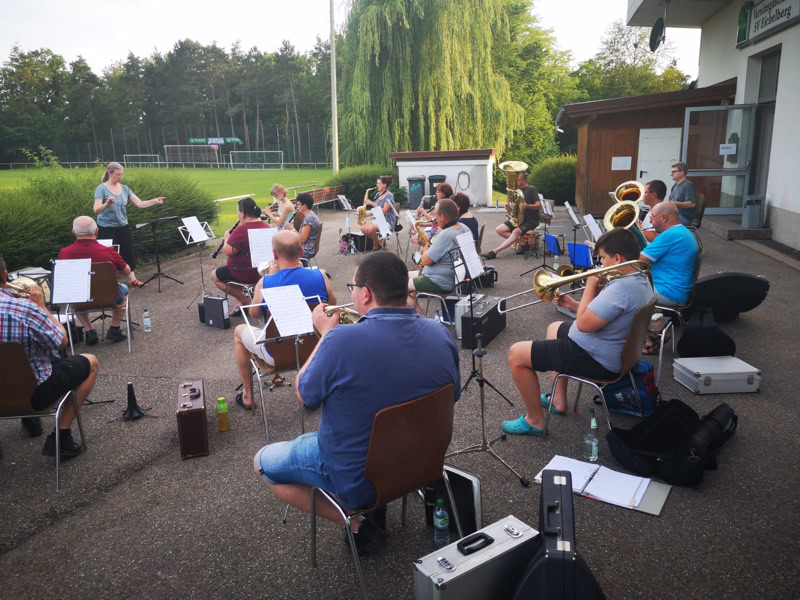 Auf dem Parkplatz des SV Eichelberg haben wir am vergangenen Donnerstag mit der 1. Musikprobe begonnen. Sofern das Wetter es zulässt, werden unsere wöchentlichen Proben weiterhin dort unter freiem Himmel stattfinden.