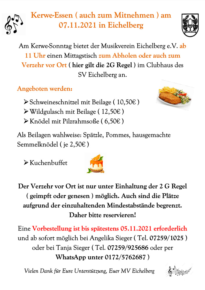 Am 07. November lud der Musikverein Eichelberg zum Kerwe-Essen ins Clubhaus des SVE ein. Angeboten wurden Wildgulasch, Knödel mit Pilzrahmsauce und Schnitzel. Auch ein großes Kuchenbuffet hat nicht gefehlt. Bei rechtzeitiger Reservierung und unter Beachtung der 2G-Regeln konnte im Clubhaus gegessen werden. Wer seine Mahlzeit lieber zuhause zu sich nehmen wollte, holte sein Essen nach vorheriger Bestellung ab. Beides fand beachtlichen Zuspruch und war ein großer Erfolg!