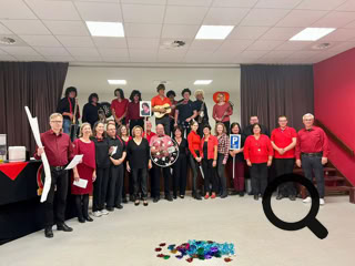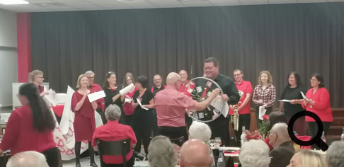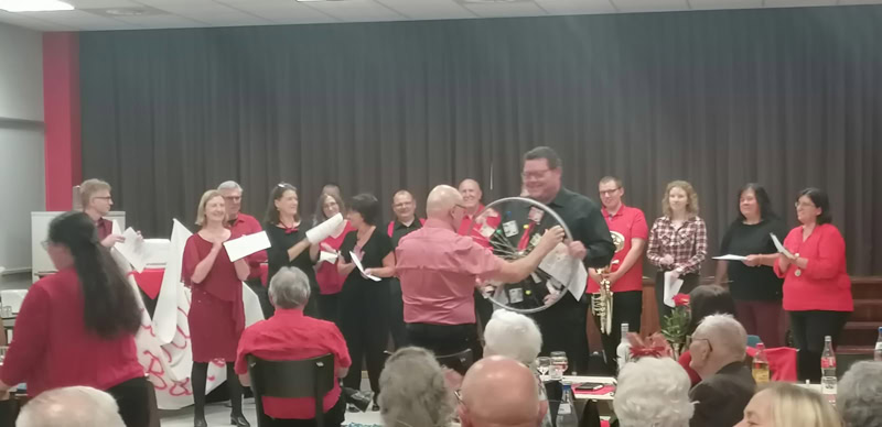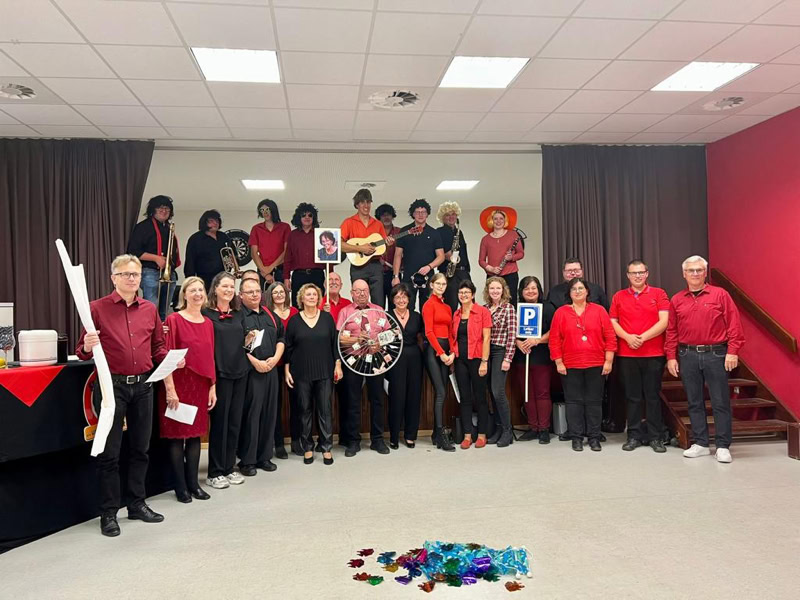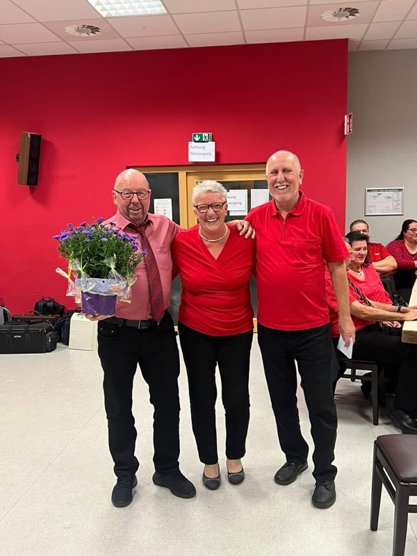 Anschließend stellten wir uns auf, um gemeinsam ein Lied für Lothar zu singen. Dabei ging der Vorhang zur Seite und Renate rief die einzelnen Musiker der „Cat River Band“ auf die Bühne!