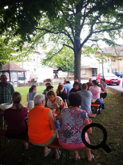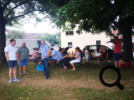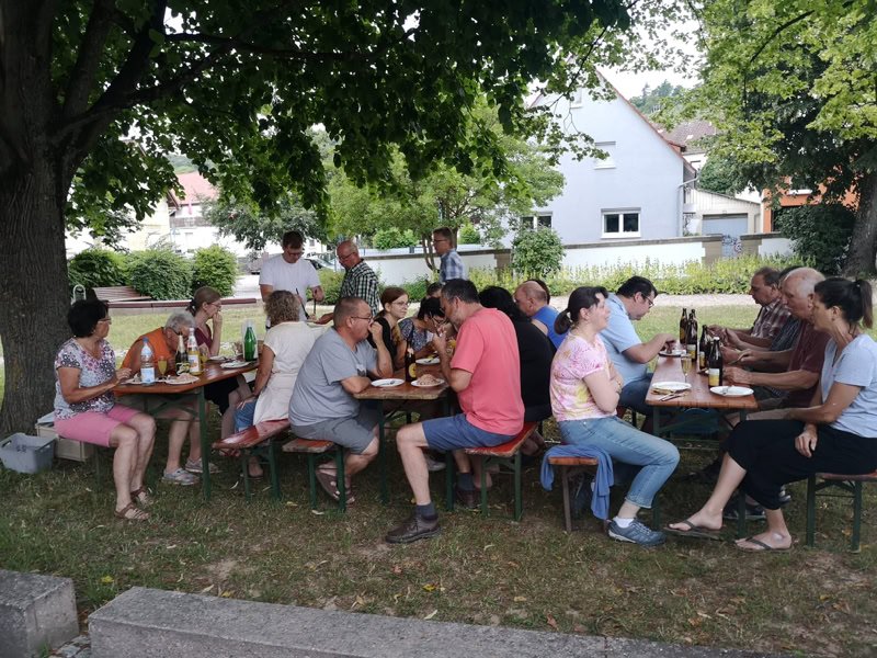 Die Arbeitsgemeinschaft Eichelberger Vereine lud anschließend zum gemütlichen Beisammensein im Park in der Ortsmitte ein. Das Ambiente und unser kleines Repertoire waren für die vielen Besucher sicherlich ein Grund mehr, bei kühlen Getränken, Brezeln, heißen Würste und Weißwürste den Frühschoppen etwas länger auszukosten.