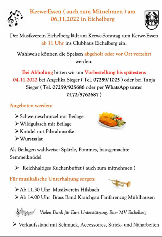 Der Musikverein Hilsbach lädt uns ein, am Sonntag, den 11. September anlässlich der “Hilsbacher Kerwe” die Besucher musikalisch zu unterhalten. Wir werden von 11:30 - 13:30 Uhr für Stimmung sorgen und freuen uns auf viele Eichelberger Musikfreunde.