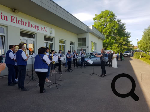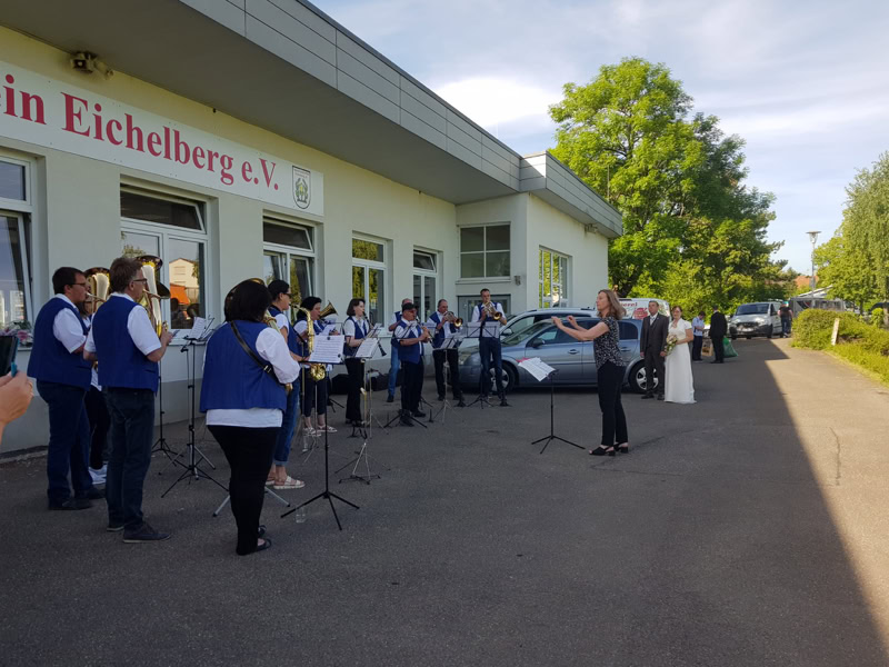 Die anschließende Hochzeitsfeier erfolgte im Clubhaus des SV Eichelberg. Ohne das sie etwas ahnten, spielten wir dem Brautpaar ein Hochzeitsständchen und die Überraschung ist uns geglückt! Joachim und Michaela haben sich sehr gefreut. Kassiererin Angelika Sieger überbrachte mit einem Blumenstrauß im Namen des Musikvereins Eichelberg die besten Glückwünsche.