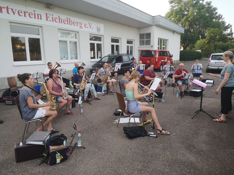 Auf dem Parkplatz des SV Eichelberg haben wir am vergangenen Donnerstag mit der 1. Musikprobe begonnen. Sofern das Wetter es zulässt, werden unsere wöchentlichen Proben weiterhin dort unter freiem Himmel stattfinden.