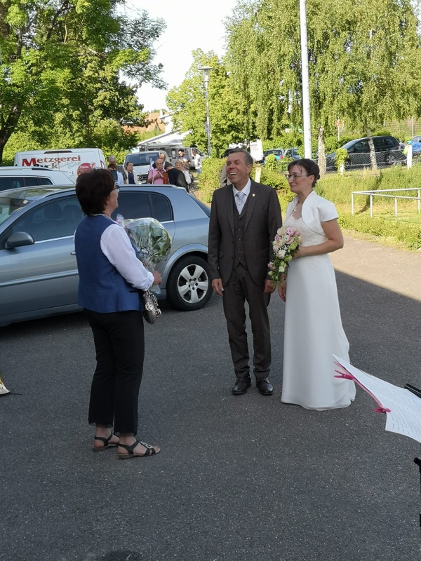 Die anschließende Hochzeitsfeier erfolgte im Clubhaus des SV Eichelberg. Ohne das sie etwas ahnten, spielten wir dem Brautpaar ein Hochzeitsständchen und die Überraschung ist uns geglückt! Joachim und Michaela haben sich sehr gefreut. Kassiererin Angelika Sieger überbrachte mit einem Blumenstrauß im Namen des Musikvereins Eichelberg die besten Glückwünsche.