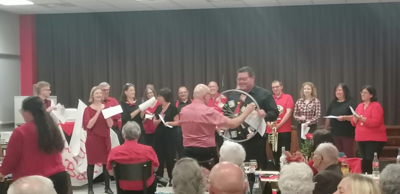 Anschließend stellten wir uns auf, um gemeinsam ein Lied für Lothar zu singen. Dabei ging der Vorhang zur Seite und Renate rief die einzelnen Musiker der „Cat River Band“ auf die Bühne!