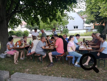 Die Arbeitsgemeinschaft Eichelberger Vereine lud anschließend zum gemütlichen Beisammensein im Park in der Ortsmitte ein. Das Ambiente und unser kleines Repertoire waren für die vielen Besucher sicherlich ein Grund mehr, bei kühlen Getränken, Brezeln, heißen Würste und Weißwürste den Frühschoppen etwas länger auszukosten.